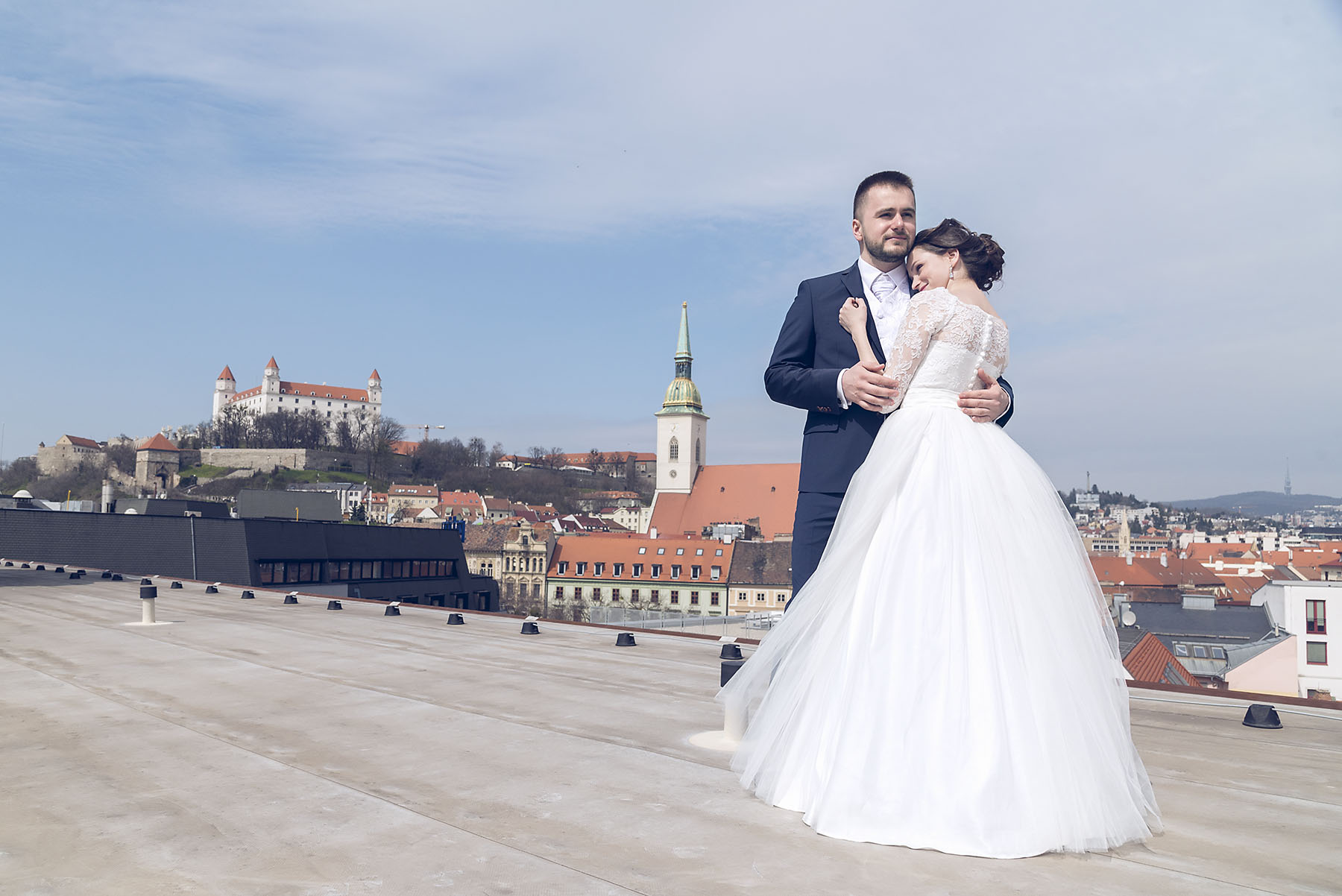 Nestáva sa mi často, že sa ocitnem fotiť na streche, ale občas sa pritrafilo. Ale ešte nikdy som nefotil na streche hotela svadobný pár. Slnečný deň s nádhernými výhľadmi, romantický hotel s luxusným interiérom, krásna nevesta a jej galantný ženích. Čo viac si môžem priať?